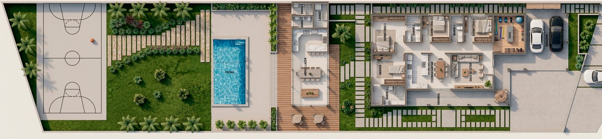 Projeto de residência térrea com acessibilidade e ambientes integrados.Área externa com piscina, espaço amplo de lazer e garagem lateral para dois veículos.Distribuição funcional pensada para o dia a dia.